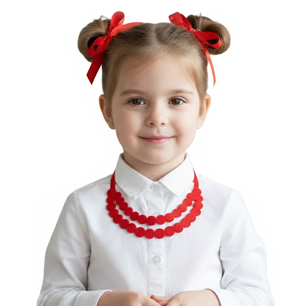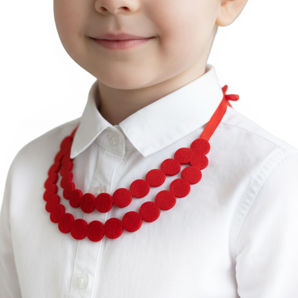 Ten wariant składa się z dwóch warstw starannie wyciętych, filcowych elementów, które pięknie układają się na dekolcie, tworząc wyrazistą i kaskadową ozdobę. Całość jest zamocowana na dwóch wytrzymałych, czerwonych tasiemkach satynowych, co gwarantuje łatwe dopasowanie obwodu do szyi dziecka lub osoby dorosłej. Mimo swojej okazałości, korale pozostają piórkowo lekkie i bezpieczne dla skóry.