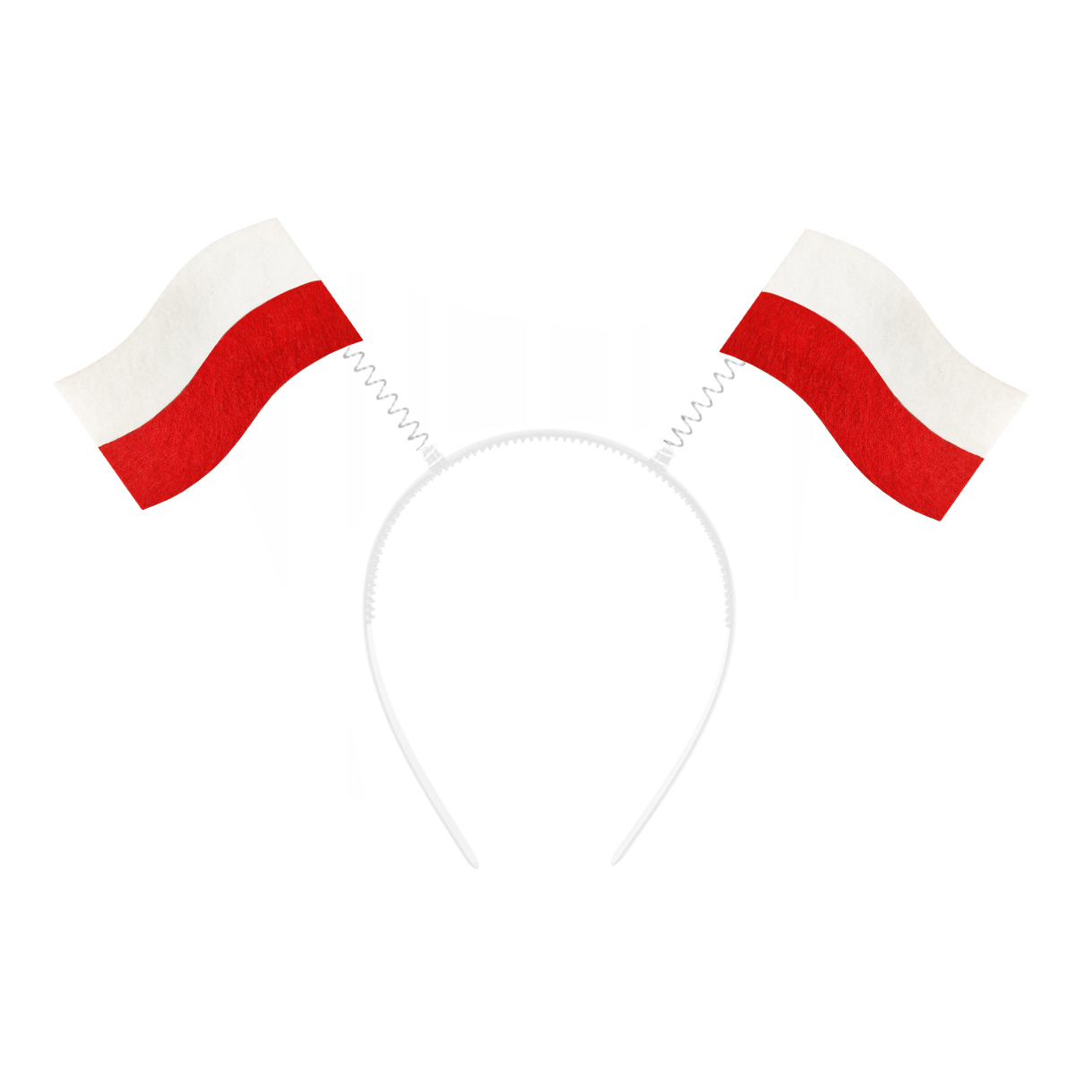 Opaska wykonana jest z białego, elastycznego tworzywa, które dobrze dopasowuje się do głowy. Jednak najważniejszym elementem są dwie miniaturowe, biało-czerwone flagi Polski! Flagi są wykonane z miękkiego filcu, co zapewnia im trwałość i estetyczny wygląd. Każda flaga jest umieszczona na sprężynce, dzięki czemu flagi dynamicznie poruszają się i "tańczą" przy każdym ruchu głowy, co dodaje energii i zabawy.